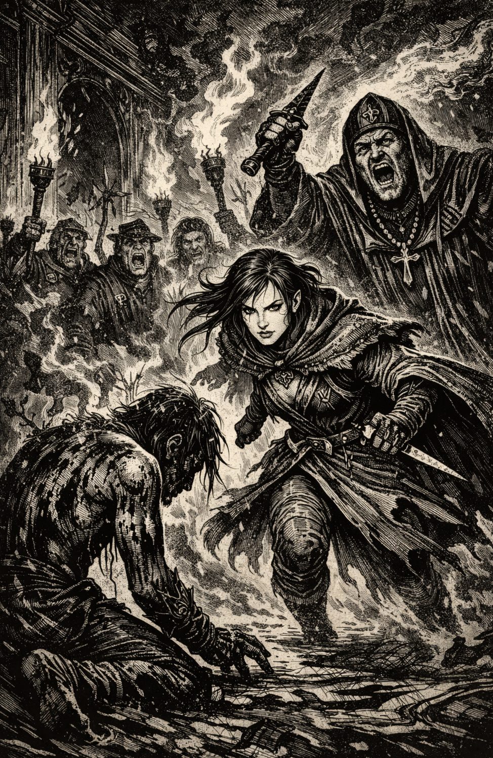 The situation unravels when Thomassen, the town priest, grows suspicious and leads two dozen men to Vale’s mansion to sacrifice him to Vitarus. Lilith rides to stop them, injects Mina with the still-untested cure before leaving, and arrives to find Vale badly burned and on his knees. She kills Thomassen. Vale kills the rest. The battle’s divine consequence is immediate — Vale, a child of Nyaxia, has murdered an acolyte of the White Pantheon. As they tend each other’s wounds, Vale tells her he has decided to return to Obitraes. Lilith tells him she is dying. He says he will take whatever she chooses to give. They spend the night together.