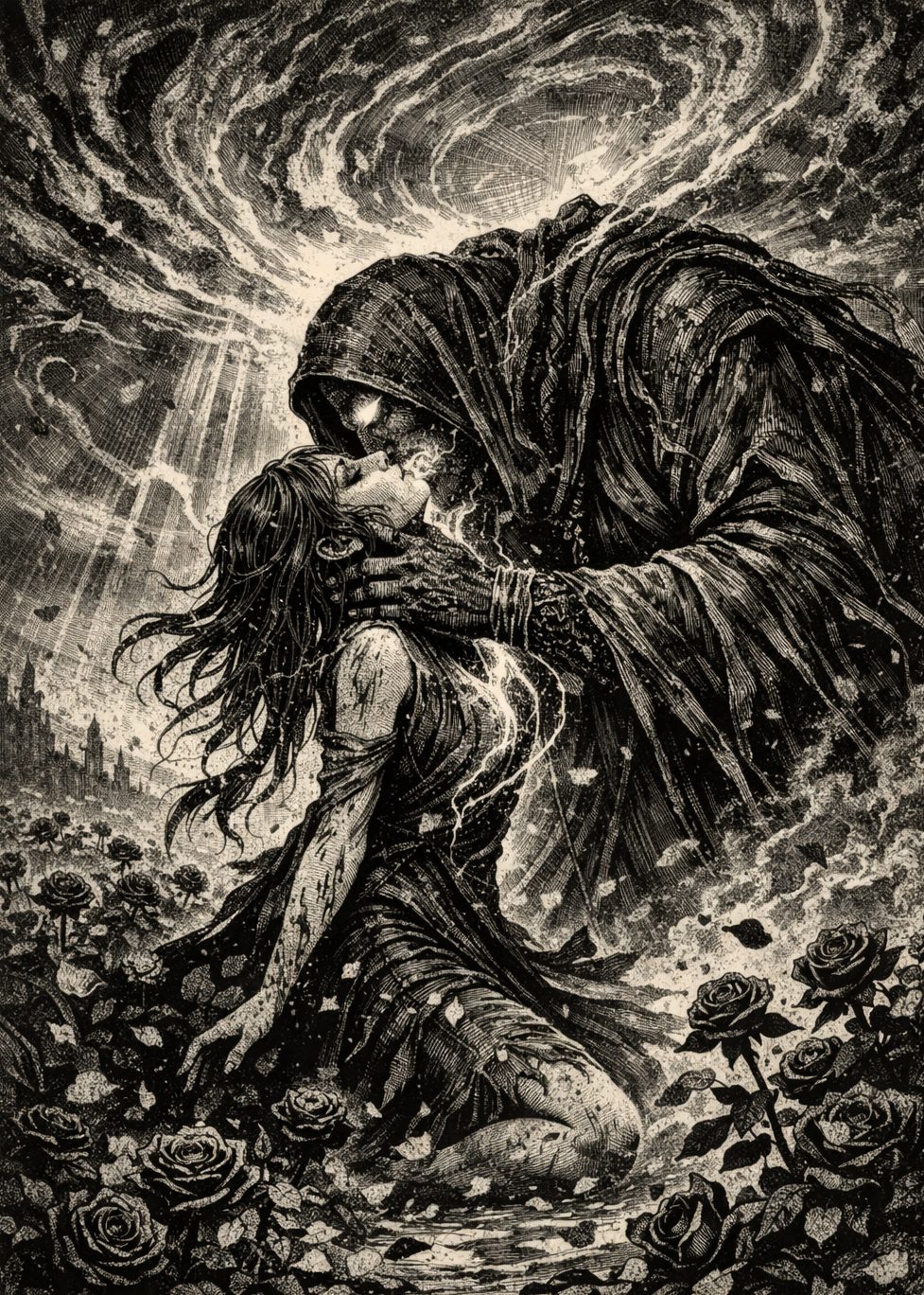 At dawn, the sky over Adcova warps — Vitarus is coming. Lilith sends Vale away and rides home to face the god herself. She finds Mina alive and standing in the rose fields — the cure worked. Vitarus descends. Lilith makes a deal: she will give back everything her father traded — soil, flowers, and herself — in exchange for lifting the plague. Vitarus seals it with a kiss that strips fifteen years of borrowed life from her body. She collapses dying. Vale, who did not leave, swoops down and Turns her, feeding her his blood and asking if she wants to live. She says yes.